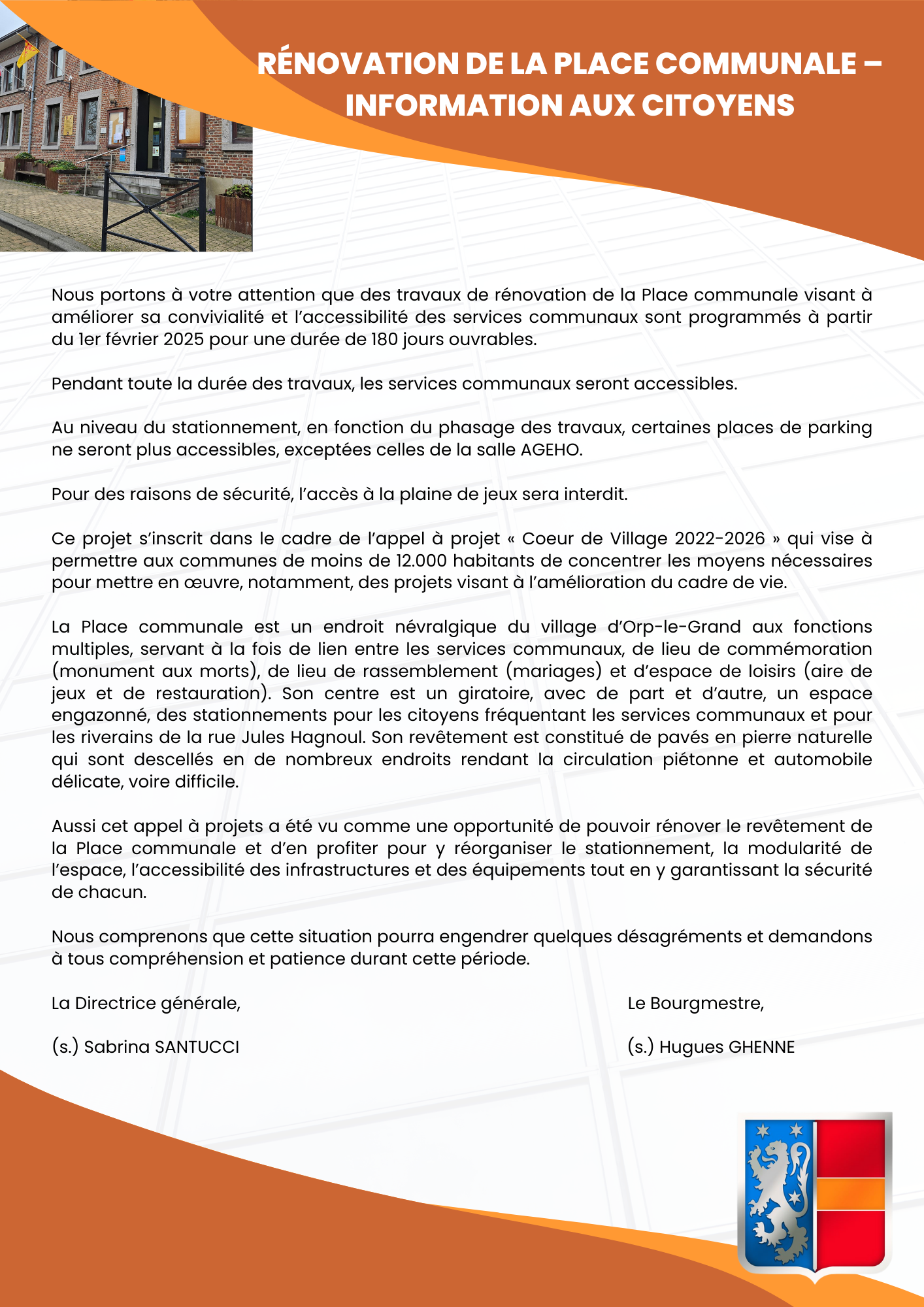 Nous portons à votre attention que des travaux de rénovation de la Place communale visant à améliorer sa convivialité et l’accessibilité des services communaux sont programmés à partir du 1er février 2025 pour une durée de 180 jours ouvrables.