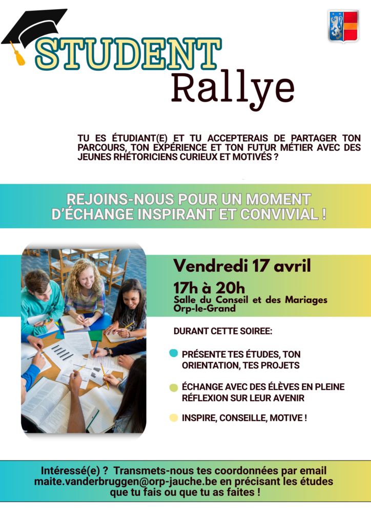 La Commune d’Orp-Jauche organise un Student Rallye, un moment d’échange et de rencontre destiné aux étudiants de l’enseignement supérieur souhaitant partager leur parcours académique et leur expérience avec des élèves de rhétorique actuellement en réflexion sur leur avenir.